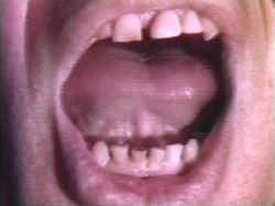 Performance and video artist Vito Acconci struggles to hold his mouth open and attempts to talk to the viewer, intoning in an almost unintelligible voice. As though under the authority of an implicit contract with the viewer, Acconci fights to keep his “promise” of remaining open. The controlled action is typical of the works in which Acconci sets up an implicit agreement to perform a specific act for the viewer.