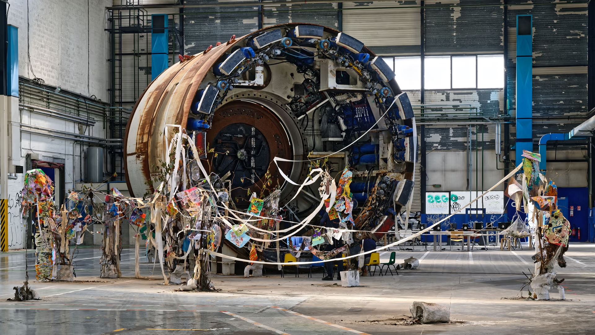 As part of In the Hole, Sam Keogh presents Knotworm, a performance-lecture combining live-feed video, text, and drawing to weave together disparate anecdotes and histories of gentrification, tunneling, sabotage, and ecology. Originally commissioned for the 15th Lyon Biennale in 2019, Knotworm was an installation of sculpture, collage, and video proliferating around the base of a colossal tunnel boring machine known as a “worm.”