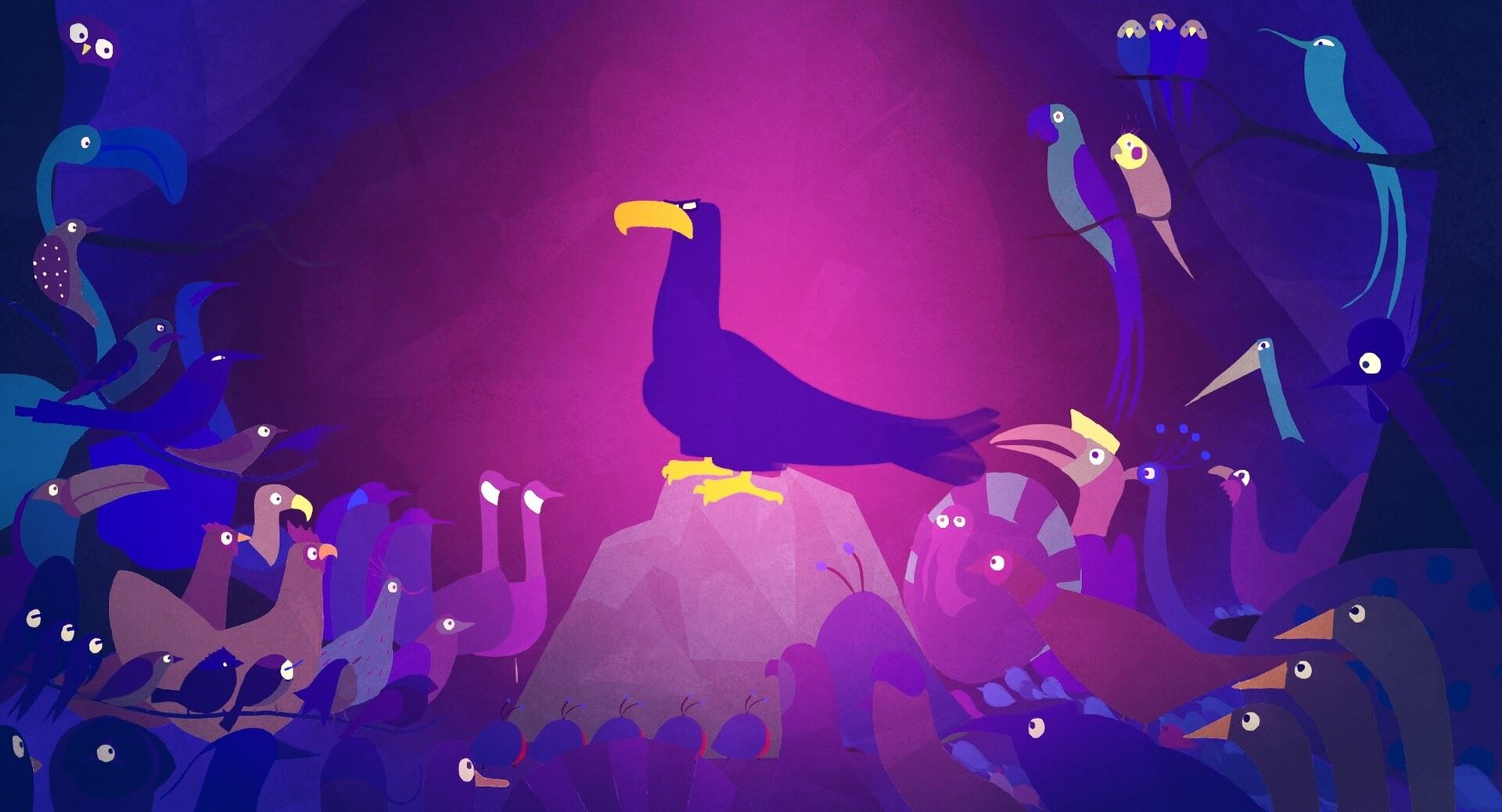 As the World of Birds meets to choose its sovereign, the golden eagle takes the throne, seeing no other member of their community worthy of the title. No one opposes the proud and powerful bird except for the kinglet, who in his small voice boldly offers to do the same. The eagle accepts his wager: the one who flies highest in the sky will wear the crown.