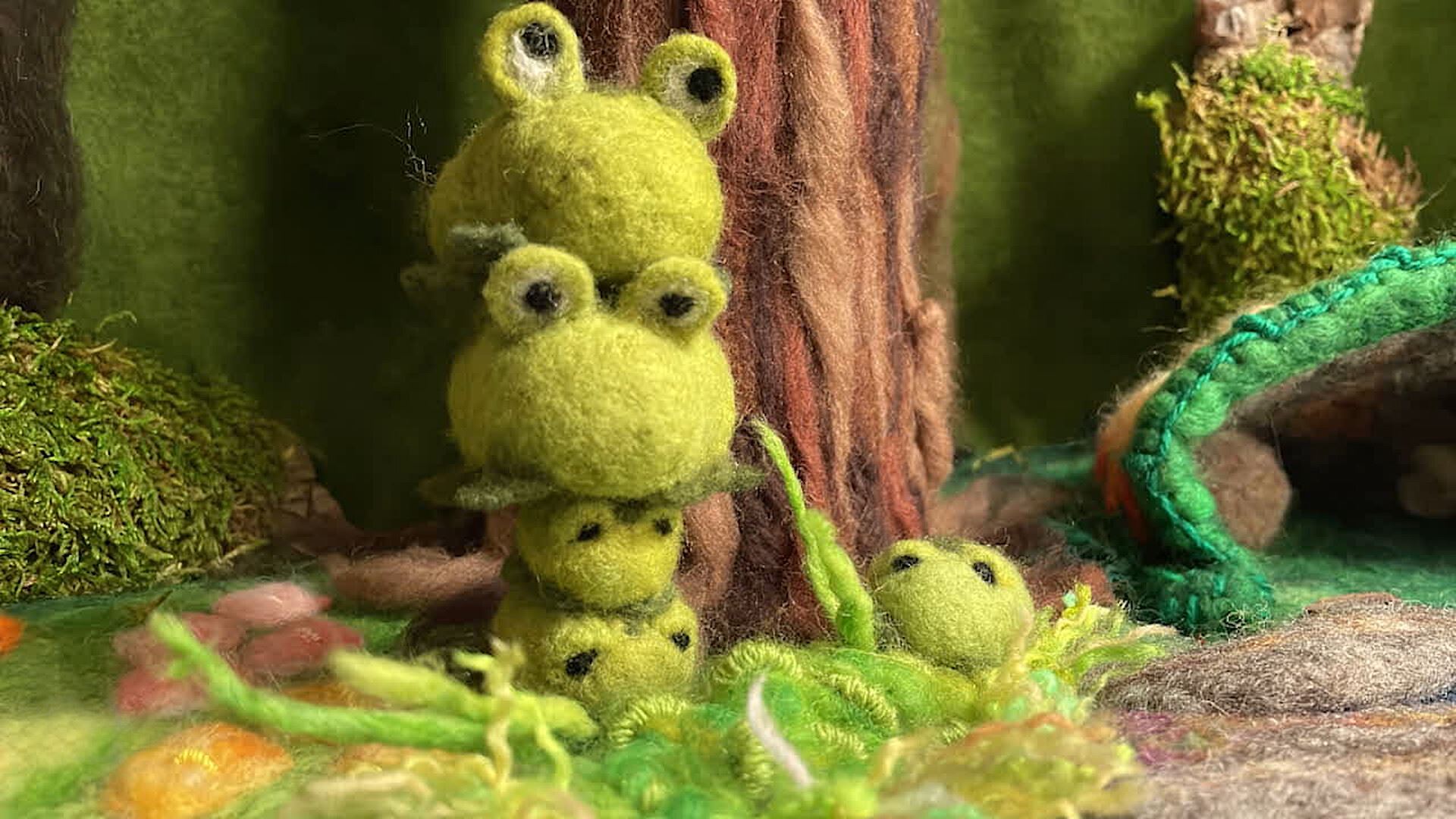 Five silly little frogs are faced with one big conundrum… can you keep up with which little frog is where? Created by award-winning children's musician Kelli Welli in needle-felted stop-motion animation.
