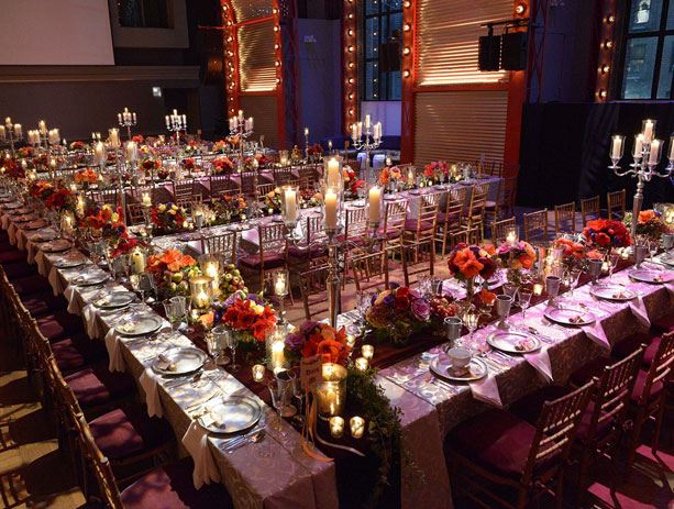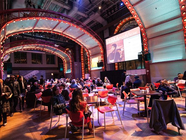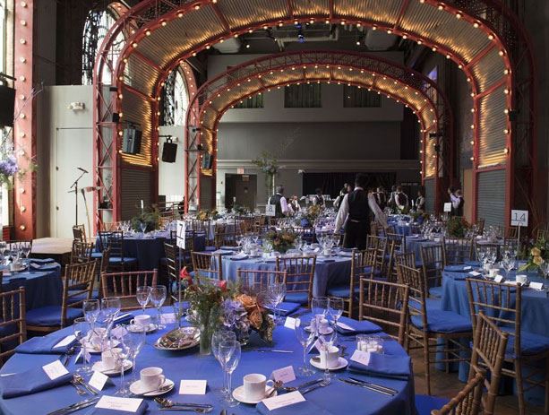 First designed as a ballroom, then recast as a theater for groundbreaking work, The Adam E. Max Gathering Space took its current design in 1997 as BAM's flexible public living room, a dazzling open-plan hall housing BAMcafé. Hardy Holzman Pfeiffer Associates oversaw the renovation, preserving the spaciousness of the original ballroom with vaulted red arches lined with silver-tipped light bulbs. This dramatic space makes a stylish setting for receptions, meetings, and parties.